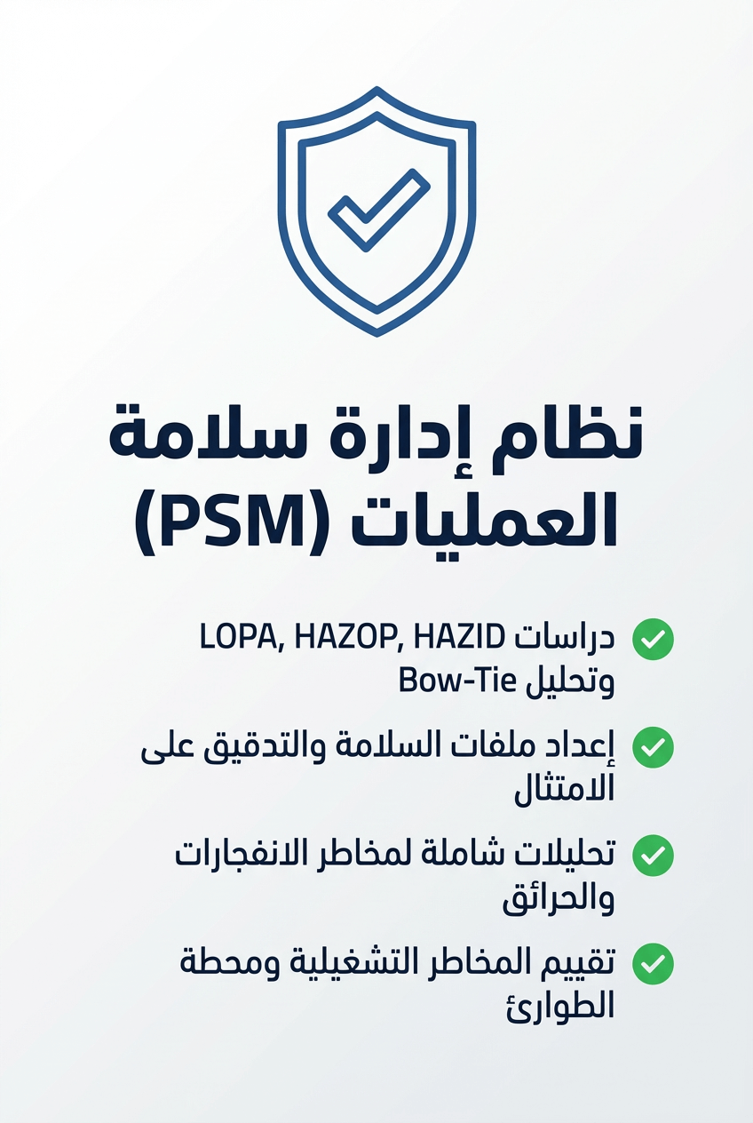 نحن شركة هندسية متعددة التخصصات تقدم حلولًا متكاملة في إدارة المخاطر، الحماية من الحرائق، سلامة العمليات، والامتثال البيئي.